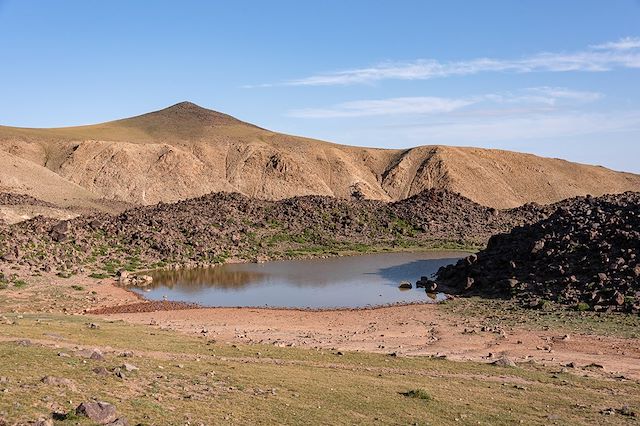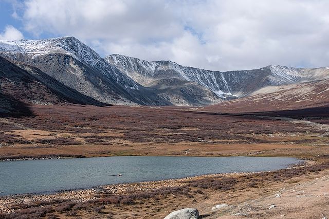 Arrivée au camp 1, proche d'un petit lac, après avoir longé le grand lac Darihan. Nous pouvons compléter la journée avec une marche de mise en jambe, soit en longeant le lac Darihan jusqu'au camp 1 (distance modulable jusqu'à 10km, sans dénivelé), soit en boucle au départ du camp pour monter voir deux petits lacs d'altitude dans une vallée surplombant notre camp (6km, +300/-300m, 2h).