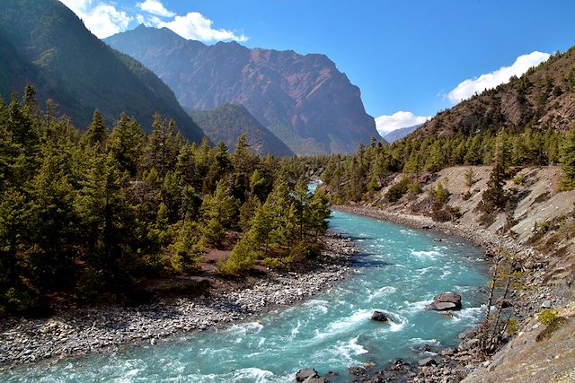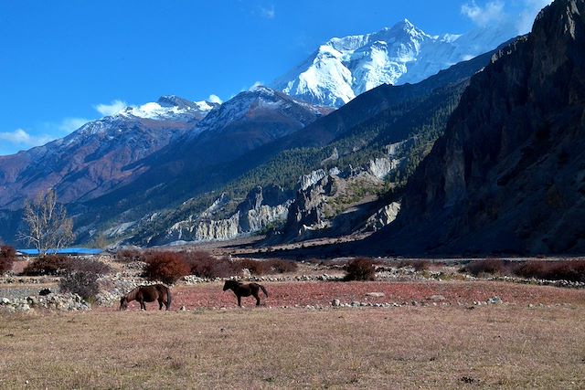 Le tour des Annapurnas est le trek himalayen par excellence. La remontée de la Marsyangdi Nadi jusqu'à Manang nous permet d'évoluer à travers une diversité de paysages exceptionnels : rizières, forêts de rhododendrons et de conifères, cultures en terrasses... le tout dominé par les sentinelles de l'imposante masse des quatre Annapurnas, le massif népalais fétiche des Français depuis l’ascension de l’Annapurna I (8091m) le 3 juin 1950 par Maurice Herzog et Louis Lachenal (première ascension d’un 8000m de l’histoire). Pisang, Manang, Muktinath, les villages manangis, thakalis, gurungs ont tous leur propre atmosphère, leur mode de vie particulier. Cet itinéraire avec nuits en lodge est adapté à l'acclimatation nécessaire pour la traversée du Thorong Pass (5416m), point culminant de votre trek qui vous fera basculer dans les hautes vallées de culture tibétaine.
