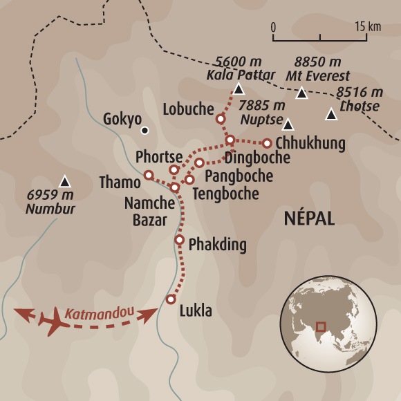 Depuis sa première ascension en 1953, l’Everest continue de fasciner. C’est au bout d’une longue vallée glaciaire que se révèle sa silhouette emblématique, point d’orgue d’un itinéraire exigeant et inoubliable. Ce trek permet à tout marcheur motivé et en bonne condition de découvrir les paysages grandioses du Khumbu, terre des Sherpas, ce peuple emblématique du "Toit du monde". L’itinéraire prend le temps de traverser leurs villages - Khunde, Khumjung, Pangboche - et de visiter leurs monastères, à Thamo, Tengboche ou encore Namche, nichés au cœur d’un monde suspendu. Une fois bien acclimatés, vous partez pour l’ascension du Kala Pattar (5600 m), un belvédère spectaculaire offrant une vue saisissante sur l’Everest, l’Ice Fall, le Nuptse (7861 m), le Pumori (7161 m)… Un rendez-vous unique avec les plus hauts sommets de la planète.