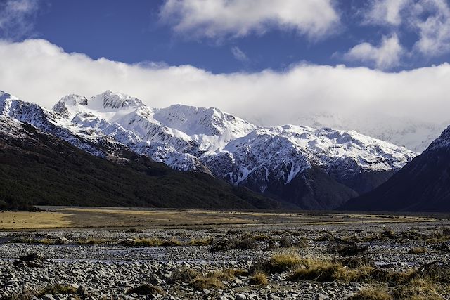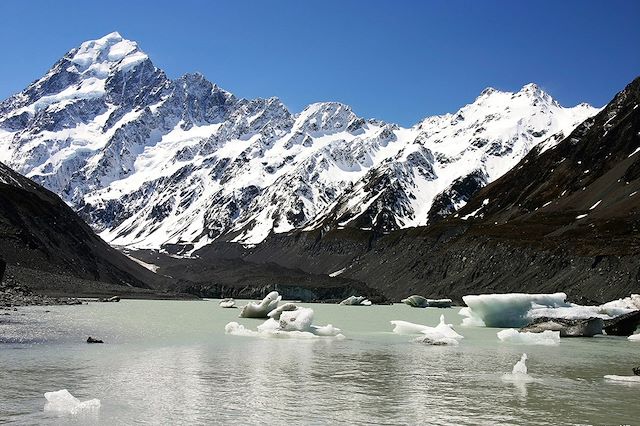 La Nouvelle-Zélande se visite généralement pendant l’été australe lorsque les températures sont au plus haut. Pourtant s’y rendre en hiver, lors de la période la moins fréquentée de l’année, a tout son intérêt. Nous partons à la découverte des paysages spectaculaires de la Nouvelle-Zélande, où les montagnes s’élèvent fièrement, recouvertes d’une neige éclatante, et où les lacs scintillent sous le soleil hivernal. Ce parcours unique nous conduira d’abord vers les charmantes stations de ski de Mont Hutt et du Lac Ohau, où les passionnés de sports d'hiver pourront s'adonner au ski et au snowboard, entourés de paysages à couper le souffle. Les journées seront ponctuées d’activités en plein air, des randonnées à travers des forêts de pins aux balades le long des lacs gelés, offrant des vues imprenables sur les sommets enneigés. Nous faisons quelques randonnées iconiques de Nouvelle-Zélande comme la « Hooker Valley Track » et le « Rob Roy Glacier Track ». Nous ne louperons pas non plus les merveilles naturelles de l’île du Sud, comme le lac Tekapo et le parc national d’Aoraki/Mt Cook, où la beauté des paysages hivernaux rivalise avec les plus belles cartes postales, mais aussi la péninsule de Kaikoura où l’on peut admirer une faune exceptionnelle. Nous embarquons pour une aventure hors des sentiers battus, où la beauté sauvage de l'hiver néo-zélandais nous attend à chaque tournant.