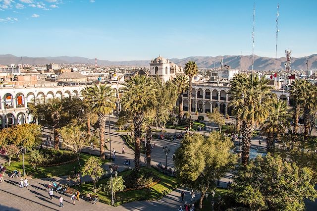 Isolée entre désert et montagnes, implantée au pied du grand volcan Misti (5820m), la belle Arequipa est actuellement la deuxième agglomération urbaine du Pérou. Fondée en 1540 par Don Garcia Manuel de Carbajal, elle a connu une extraordinaire prospérité grâce à la commercialisation de l'argent extrait de Potosi en Bolivie aux XVIIe et XIXe siècles. Le négoce de la laine d'alpaga a favorisé cette économie florissante, en témoignent les multiples monuments et innombrables églises, demeures seigneuriales ("casonas") et couvents. Le magnifique monastère de Santa Catalina, construit avec le "sillar", la pierre volcanique blanche qui a donné son surnom à la ville, est incontournable.