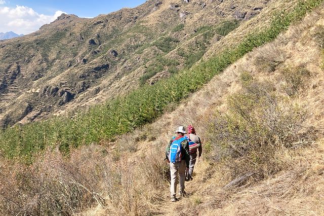 Ce voyage de trois semaines à travers le Pérou nous invite à marcher dans les pas de civilisations millénaires. Idéal pour les randonneurs curieux d’histoire et de nature, il nous conduit de Cusco à Arequipa, en passant par Lares, le lac Titicaca et le canyon de Colca. À Cusco, “le nombril du monde”, nous prenons le temps de nous acclimater avant de nous enfoncer dans la vallée de Lares. Quatre jours de marche, accompagnés de nos lamas, des nuits chez l’habitant, la Pachamama en toile de fond et le sentiment d’être au cœur des Andes vivantes. Chaque étape est l’occasion de partager des moments de vie avec nos hôtes, comprendre leur lien avec la terre et apprécier leur hospitalité simple. Nous nous régalons de produits issus d'une agriculture biologique nourrie de rituels andins. Puis, cap sur le lac Titicaca, miroir d’altitude et cœur battant des traditions Aymaras. Plus loin, le canyon de Colca dévoile ses falaises vertigineuses : nous y randonnons trois jours, sous le vol des condors. Enfin, Arequipa, la “ville blanche”, nous enveloppe dans sa lumière et sa douceur, entre volcans et héritage colonial.