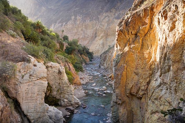 Après le petit déjeuner, nous montons à pied jusqu’aux villages de Coshnirhua et Malata, dont nous visitons les vieilles venelles silencieuses. Puis, nous redescendons par un sentier qui traverse une série de hameaux dont les habitants se consacrent à la culture d’avocats, de fruits et de la "cochenille", recherchée pour sa couleur rouge vif. Après cette belle descente, nous arrivons à "l’oasis" de Sangalle, un village situé au fond du canyon du Colca, avec la possibilité de piquer une tête dans les piscines du village.