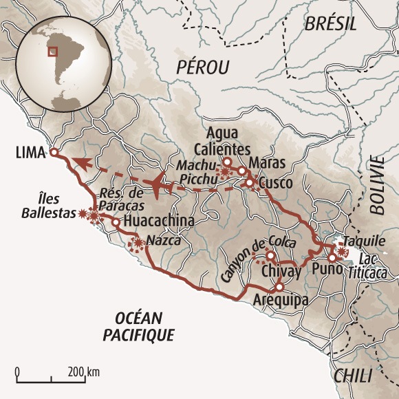Un itinéraire pour tout connaître de la culture inca, tout en pratiquant des activités sportives et ludiques, pour tous les âges. De la côte pacifique avec les lignes mystiques de Nazca jusqu’à Cusco, la divine capitale inca, en passant par le lac Titicaca et le canyon de Colca, l’aventure vous mène au point d’orgue de votre voyage : le Machu Picchu. Vous visitez les plus grands sites péruviens, en VTT, à pied ou sur l'eau. Un voyage qui mêle l’histoire et la nature, l’humain et le sacré, et qui ne peut vous laisser indifférent.