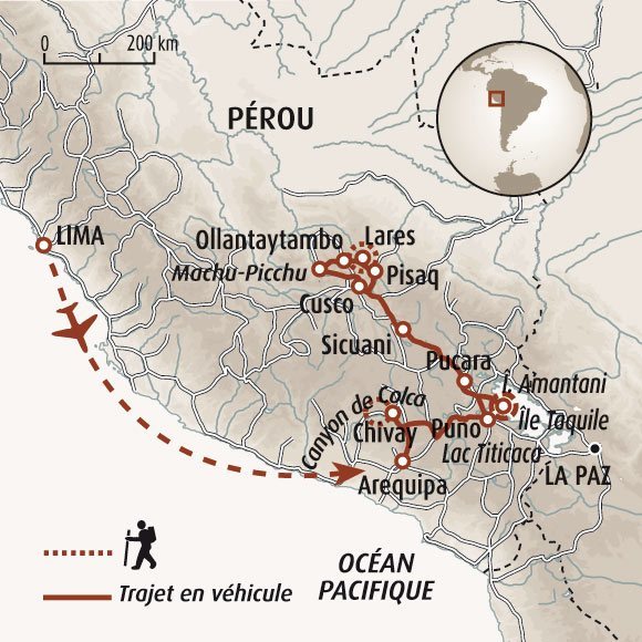 Le Pérou est un pays de diversité et de contrastes : climats, reliefs, peuples et cultures, faune et flore, spécialités gastronomiques, se déclinent à l'infini, composant un tableau aux mille couleurs. Ce voyage vous propose une visite complète au cœur de l'Empire inca, à la découverte des sites remarquables et sanctuaires préservés : Arequipa la blanche, la brèche du canyon de Colca, le lac Titicaca et ses îles, Cusco, la vallée sacrée des Incas et le Machu Picchu bien sûr. Au fil de cet itinéraire, vous découvrez également la vallée oubliée de Lares et ses habitants, qui seront vos hôtes durant quatre jours de trek accompagné de lamas. Une expérience inoubliable entre passé et présent !