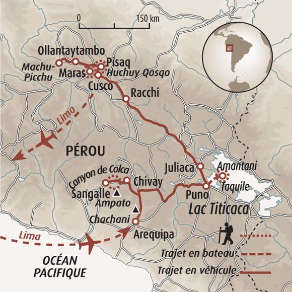 Depuis Arequipa vous randonnez au plus profond du canyon de Colca et découvrez les petits villages dominés par le majestueux condor. Vous poursuivez vers le lac Titicaca et ses îles avant d'atteindre Cusco. Ancienne capitale de l'empire inca, vous parcourez ses ruelles pavées et ses nombreux sites et églises. A pied et avec vos lamas, vous regagnez Huchuy Qosqo, découvrez la vie chez l'habitant dans ces petits villages suspendus au-dessus de la vallée Sacrée. Un itinéraire complet alliant découverte et trekking à travers des paysages d'une grande diversité, le tout en immersion chez l'habitant.