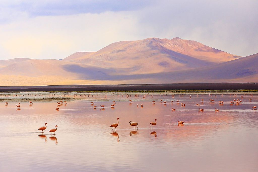 Cap sur le salar de Chuguana et son volcan Ollagüe, véritable colosse de 5870m qui abrite l'une des plus hautes mines de soufre du monde. Nous longeons la frontière chilienne en empruntant la "route des joyaux" : Lagunas Honda, Ch’arkota, Hedionda et Cañapa, sanctuaires de trois variétés de flamants roses, avant de traverser le désert de Siloli, célèbre pour son fameux "arbre de pierre". En fin d’après-midi nous arrivons à la Laguna Colorada, qui tire son intense coloration rouge brique de la présence de phytoplancton. Installation au refuge et dîner.