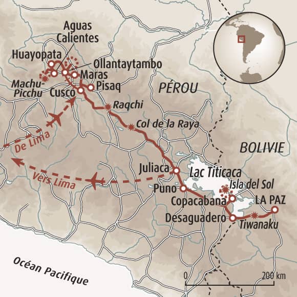 De Cusco, nombril de l’empire Inca, à la bouillonnante ville de La Paz, partons pour une traversée originale de l’Altiplano. Ce voyage s’adresse aux amateurs des Cités d’Or, aux passionnés d’histoire inca. De la vallée sacrée au lac Titicaca, nous suivons le fil rouge des civilisations andines. Les paysages se dévoilent peu à peu : montagnes éclatantes autour de Cusco, villages coloniaux animés, plantations de café et de cacao aux portes de l’Amazonie. Le Machu Picchu, incontournable, fascine toujours par sa force et sa beauté. Plus au sud, nous glissons vers le lac Titicaca, vaste miroir d’altitude où vivent les communautés quechuas et aymaras. Nous découvrons leur quotidien rythmé par la nature sur l’Ile du Soleil. La Paz, point final de cette aventure, s’admire depuis le ciel et se vit au cœur de ses ruelles labyrinthiques. Train, bateau et bus local jalonnent cette itinérance accompagnée d’un guide passionné et ponctuée de temps libres pour savourer chaque lieu à notre rythme.