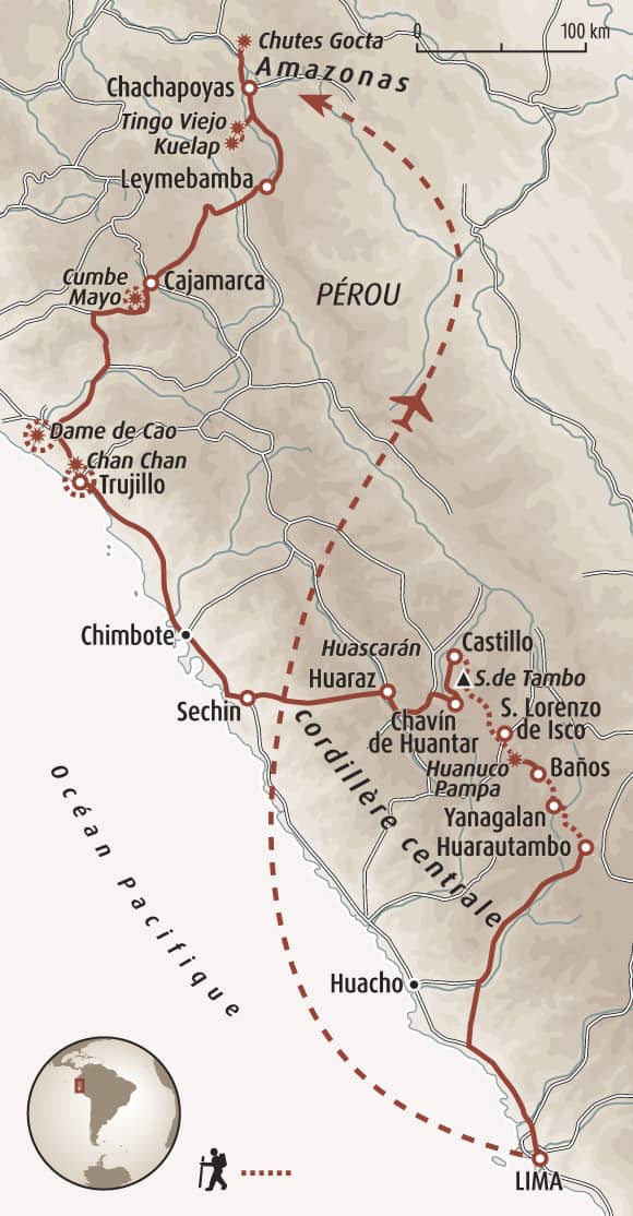 -en cas d’indisponibilité du vol à destination de Chachapoyas, nous pourrions être amenés à réserver un vol alternatif vers Jaén, Tarapoto ou Chiclayo, suivi d’un transfert en bus, pour une durée de trajet comprise entre 4h et 9h, selon la destination retenue. Dans ce cas, les visites prévues ce jour-là ne pourront pas être assurées.