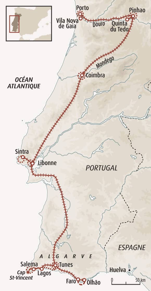 Un dicton portugais résume bien ce voyage : « un petit pays qui a une grande Histoire ». Il s’adresse à ceux qui aiment parcourir un territoire pas à pas, en train et à pied, pour en saisir les nuances. Depuis Porto, vous suivez les courbes du Douro, entre vignobles en terrasses, quintas et cultures. La marche rythme les journées et ancre le voyage dans le paysage. Après Coimbra, vous gagnez Lisbonne puis Sintra, écrin aux palais et chemins boisés. En Algarve, falaises et plages ouvrent le voyage sur l’Atlantique, entre villages blancs et douceur méridionale. Une traversée du Portugal au rythme des rails, entre culture, paysages et art de vivre.
