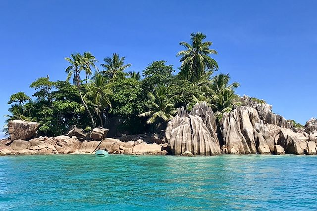 Départ en bateau** vers les îles au large de La Digue, arrêt snorkeling vers îlot Coco, parc national marin protégé qui offre une riche faune sous-marine. On y trouve notamment des pélagiques comme les raies ou les bébés requins, mais aussi des poulpes ainsi que diverses espèces de poissons aux multiples couleurs. Balade de 30 minutes en bateau, et snorkeling dans la réserve qui abrite également une petite plage, proche de l'îlot coco. Ce petit bout de terre a conservé son état sauvage, de par sa petite taille inappropriée pour des habitations.