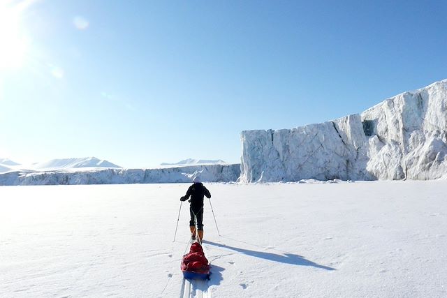 Ce raid à ski est une immersion dans le désert glacé du Spitzberg : 12 jours d'autonomie totale avec une pulka, dont 4 à 5 jours sur la banquise de la côte orientale de l'archipel. Ce raid est bien plus qu'une simple expédition : c'est une aventure qui met à l'épreuve votre endurance, votre résilience et votre capacité à affronter l'imprévu. La pulka, votre fidèle alliée, glisse derrière vous, chargée de tout le nécessaire pour survivre dans cet environnement extrême. Les journées sont rythmées par l'effort physique et la contemplation des paysages, où chaque détail est sculpté par cette nature immuable. Ouvrez l'œil, vous pourriez croiser un ours polaire. Chaque soir, le bivouac devient un précieux refuge, un moment de répit et de repos où l'on peut se réchauffer et se blottir contre le froid mordant. C'est une expérience qui vous transformera, vous laissant avec des souvenirs indélébiles et une fierté d'avoir surmonté les défis de l'Arctique.