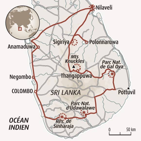 Ce voyage s'adresse aux voyageurs curieux de nature, en quête d'authenticité et de dépaysement. Il se déroule pendant la saison estivale, idéale pour pour profiter des jolies plages de sable blanc de la côte est et pour visiter certains parcs nationaux, où les conditions pour observer les animaux sont optimales durant cette période. Notre périple nous mène à certaines étapes loin des foules, pour découvrir des parcs nationaux moins fréquentés mais prévoir également quelques étapes incontournables. En 15 jours, nous découvrons la richesse et la diversité du Sri Lanka, et à chaque étape, une nouvelle facette de l'île. Notre périple nous mène des lagunes de Negombo aux savanes d'Udawalawe et de Gal Oya, en passant par les plages bordées de cocotiers de Nilaveli, la mystérieuse forêt primaire de Sinharaja, les montagnes et plantations verdoyantes du centre, ou encore les plaines où se dressent fièrement les sites historiques de Sigiriya et Polonnaruwa, inscrits au patrimoine mondial de l'UNESCO. Une véritable mosaïque de paysages se déroule sous nos yeux, tout en prévoyant des temps de détente et de liberté. A certaines étapes, nous profitons de deux nuits consécutives dans de confortables éco-lodges, ou bien en bord de mer, pour des moments de tranquillité, pour explorer librement les alentours ou choisir des activités selon vos envies. Une découverte du Sri Lanka sous plusieurs aspects, entre culture, nature préservée, biodiversité, patrimoine et moments de détente.