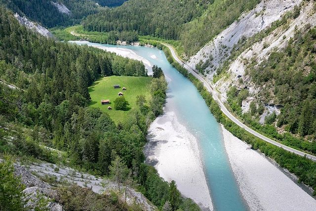 Aujourd’hui, votre balade vous emmène à travers l’un des paysages le plus impressionnants des Alpes : elle serpente au cœur d’une forêt, rencontre une rivière et des voies ferrés. Vous empruntez l’ancien pont de Versamertobel, accessible aux vélos, pour découvrir les spectaculaires gorges du Rhin. Vous traversez le joli village de Valendas, sans passer à côté de sa fontaine en bois historique et de ses maisons patriciennes. Enfin, Illanz, première ville sur le Rhin, se trouve au bout du chemin avec son centre-ville pittoresque et animé.