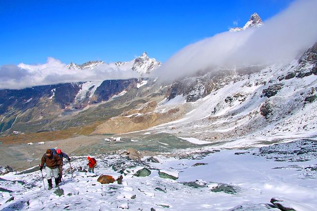 La journée démarre en empruntant les remontées mécaniques du Matterhorn Paradise. Traversée majestueuse entre les sommets mythiques du Mont Rose au Cervin, avec une pause au Klein Matterhorn, à 3883m ! Court transfert jusqu'à Schwarzsee et la randonnée se poursuit au pied de l'imposante face Nord du Cervin, en traversant les villages traditionnels de Biel, Zmutt et Hubel, jusqu'à Zermatt.
