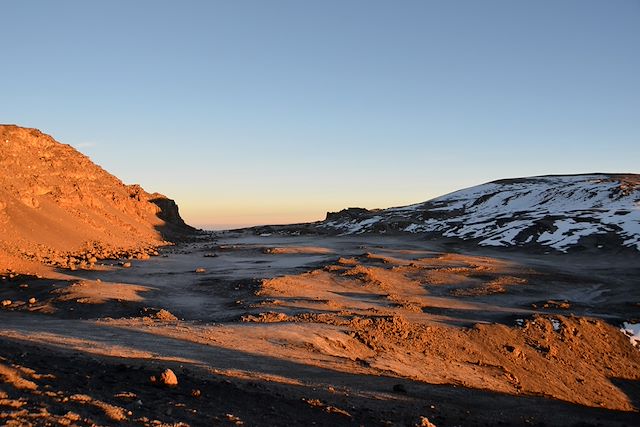 Nous remontons une moraine jusqu’au camp de Barafu à 4640m. A droite le cratère du Mawenzi (5149m) s’offre, majestueux, et au-dessus de nos têtes, notre objectif, le Kibo. Préparation du sac pour l’ascension finale et repos car le départ se fera avant minuit !