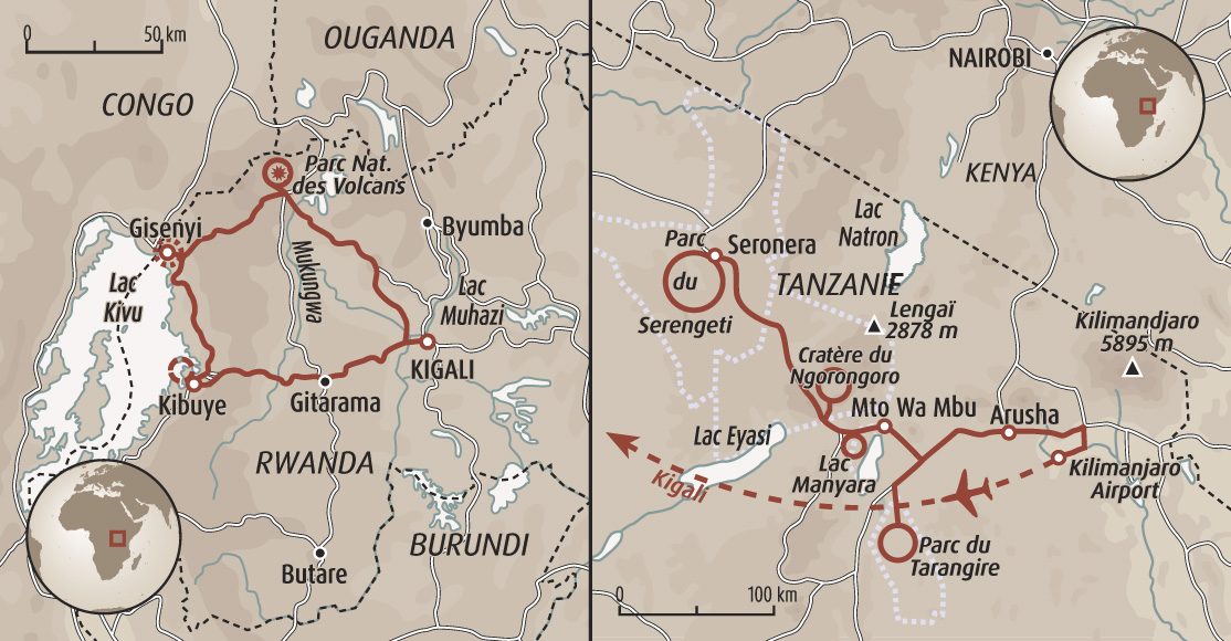 Découverte de la Tanzanie et de ses parcs animaliers uniques au monde. Chaque parc a son propre écosystème, certains dans le prolongement d’autres, et avec des corridors permettant les migrations des grands mammifères. Les reliefs, dus à l’activité volcanique liée à la grande faille africaine qui s'étend de la mer Rouge au golfe du Mozambique, vous font découvrir une diversité de paysages, des collines ondulées aux hauts plateaux, des immenses étendues sauvages du Serengeti au cratère du Ngorongoro. Partez ensuite à la rencontre de nos amis les primates au Rwanda. Sur les traces de la célèbre primatologue Dian Fossey, une approche au plus près des gorilles des montagnes.