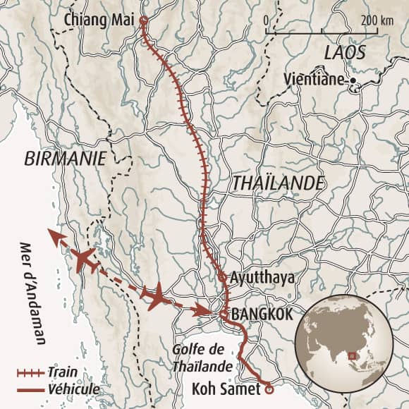 Partir à l'aventure dans un pays chaleureux, diversifié et parfait pour une première immersion en Asie. Un voyage en toute liberté en utilisant les transports locaux comme le train, le tuk-tuk et le ferry pour découvrir l'incontournable capitale vibrante et visiter les temples d’Ayutthaya pour s'immerger dans l'histoire du royaume de Siam. Puis direction le nord pour explorer Chiang Mai, ses rizières, ses temples et ses montagnes environnantes. Les superbes plages de Koh Samet viennent couronner ce voyage aux senteurs exotiques.