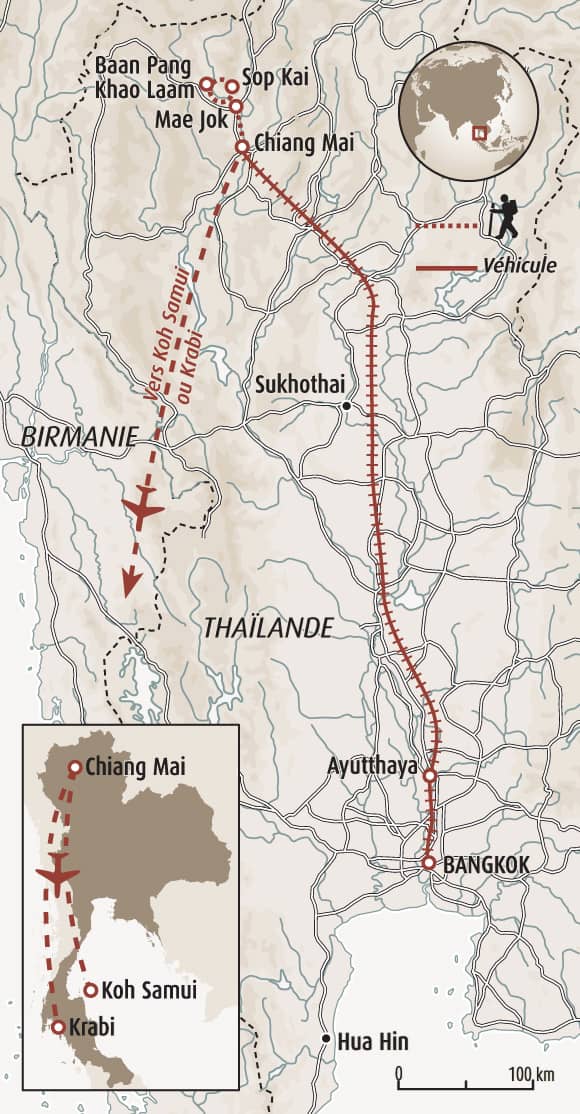 Un voyage idéal pour le bonheur de toute la famille ! Après avoir profité de l’incontournable et vibrante capitale qu'est Bangkok, vivez l’expérience du train local qui vous mène aux temples historiques d’Ayutthaya ; à découvrir à vélo pour le plaisir des grands comme des petits. Place ensuite à l’aventure en toute sécurité dans les montagnes au nord de Chiang Mai avec une balade éco-responsable, la baignade avec les éléphants et la descente de la rivière en raft. Vous partez enfin à la découverte de Krabi, destination incontournable du pays pour les amateurs de belles plages. Un décor de carte postale vous attend, entre cocotiers et plages de sable blanc. En été, nous privilégions les plages de rêve de la fameuse île de Koh Samui.