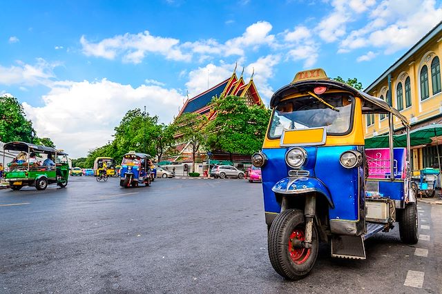 De retour dans la vieille ville de Bangkok, une courte promenade à travers le marché aux fleurs coloré de Pak Klong Talad vous permettra de prendre conscience de l'importance des fleurs dans la vie des Thaïlandais, ainsi que de découvrir leurs différents usages et symboles. Laissez vos enfants vous défier dans l'art du pliage de fleurs, que tous les Thaïlandais apprennent dès le plus jeune âge ! Ensuite, sautez dans un tuk tuk pour une escapade vers le temple de Wat Saket, plus connu sous le nom de Montagne d'or, depuis lequel vous pourrez admirer une vue panoramique du quartier royal et de la ligne d'horizon de la ville, soulignant les contrastes de Bangkok, entre temples étincelants et gratte-ciel modernes. À quelques mètres de là, vous vous mêlerez aux habitants qui se réunissent en fin d'après-midi pour le dîner. Réchauds fumants, artistes de la cuisine thaïlandaise, arômes savoureux envahissant la rue, votre après-midi se terminera avec le spectacle de ces cuisiniers en train de vous préparer une de leur spécialités dont raffolent les habitants.