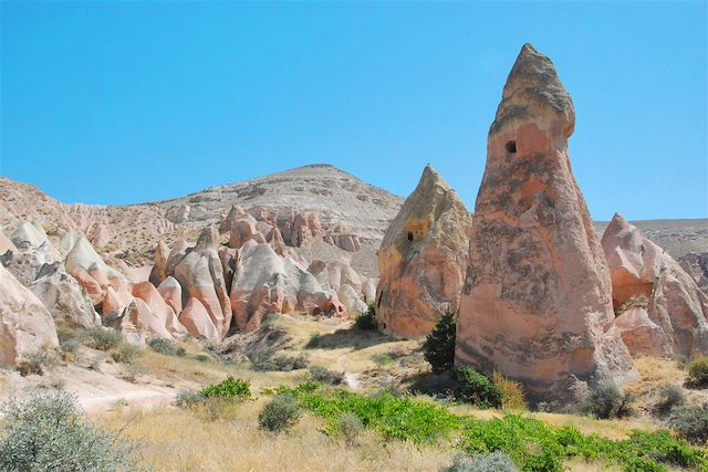 Nous commençons la journée par la découverte de la vallée de Zelve avec une petite marche jusqu’aux cheminées de fées de Pasabag (les “vignes du Maître”) ; leur forme conique quasi parfaite a forgé la légende selon laquelle les fées qui habitaient à l’intérieur jetaient des sorts aux voyageurs égarés. Sur le chemin, nous admirons les nombreux reliefs d'érosion, pénitents, meringues, et des formations variées colorées de blanc, ocre, rose...