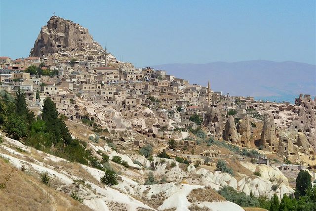 Arrivée au village d'Uçhisar, regroupé autour de son promontoire rocheux appelé la Forteresse (une crête de cendres volcaniques en réalité), habitée durant la période hittite. Nous montons au sommet du château dominant le village et où une vue panoramique sur toute la Cappadoce s'offre à nous.