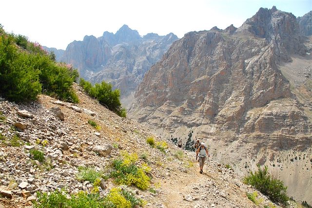 Le matin, après le petit déjeuner, nous partons en direction de la gorge de Siyirma Bogazi à travers les genévriers, thuyas et pins. Nous arrivons dans un cirque composé de beaux sommets calcaires aux parois claires, aux altitudes comprises entre 3500 et 3688m. L'environnement est ici très sec : pas de torrents, pas de lacs, pas même une source. Nous remontons le long du flanc de vallée jusqu'au plateau d’Eznevit à 2410m d’altitude. Nous nous arrêtons à proximité des populations semi-nomades pour le pique-nique du midi, l'occasion de partager un moment avec eux. Après le déjeuner nous reprenons notre route en direction du camp de Sokullupinar. Durant cette marche, de très belles vues dégagées sur l’ensemble du paysage s'offrent à nous. Arrivée à Sakartas (2350m) pour une dernière pause, d'où nous pouvons apercevoir le camp de Sokullupinar. Dernière descente pour rejoindre notre camp (2000m), et installation pour la nuit.