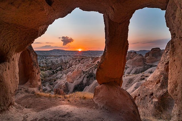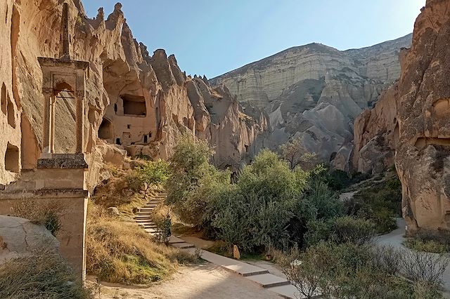 Notre randonnée se poursuit dans la vallée de Kizilçukur (ou vallée rouge) qui doit son nom à ses belles couleurs rouge et rose. Nous apercevons ici comment, au fil de millions d'années, le vent et la pluie ont sculpté cette roche volcanique. Dans ce paysage lunaire, l'homme y a laissé sa trace en intégrant des habitations troglodytiques en grand nombre et des églises décorées de fresques encore bien conservées.