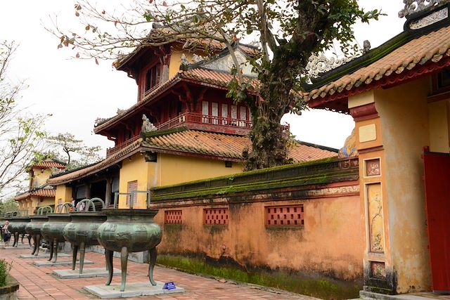 Nous découvrons entre autres l'esplanade des Grandes Salutations, le palais de l'Harmonie Suprême, le temple de culte des Nguyen, les ruines du palais des audiences, lieu de résidence du roi, le palais des reines mères, le bureau des mandarins de l'empereur Bao Dai, le pavillon de la Paix ou Bibliothèque Royale, le Jardin Co Ha qui fut réservé aux princes et princesses, le temple de culte des Nguyen.