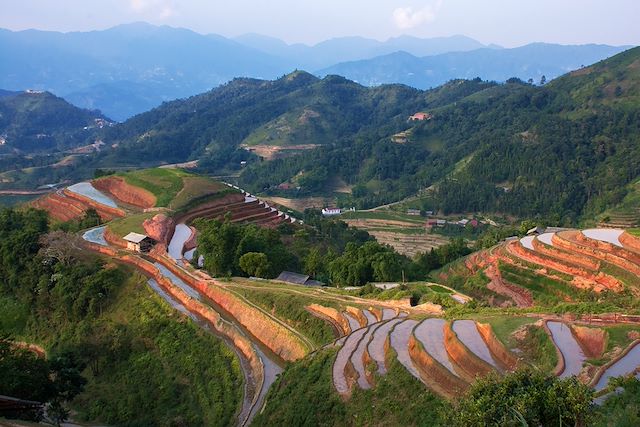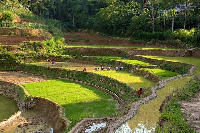 Le matin, marche sur les sentiers tracés serpentant à flanc de montagnes bordés çà et là de théiers centenaires aux troncs mousseux. A chaque détour, à chaque virage, un nouveau point de vue s'ouvre sur un amoncellement de rizières en terrasse, façonnées par l'homme à travers les générations.