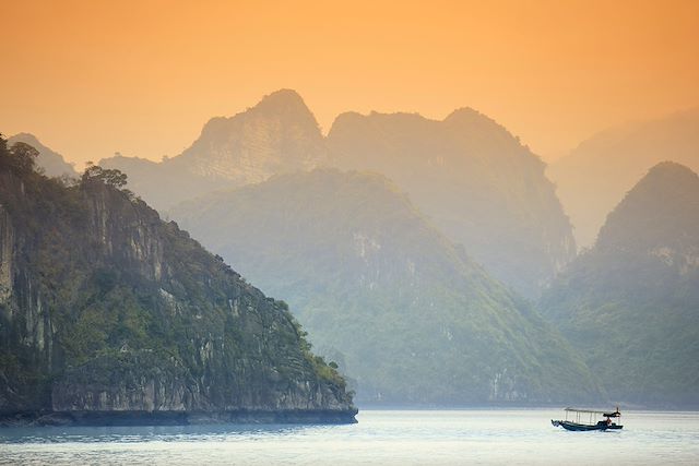 Le matin, transfert pour la baie d'Halong. À l’arrivée, formalités d’embarquement en jonque pour une croisière avec nuit à bord. Accueil par l’équipage avec verre de bienvenue avant de larguer les amarres. Installation dans les cabines puis déjeuner de spécialités locales. Durant cette croisière, découverte de cet immense chaos de pitons et mamelons karstiques aux formes fantomatiques, émergeant des eaux émeraude ; de ces pains de sucre aux formes toujours plus tourmentées, criblés d’anfractuosités, de grottes et parsemés de lagons inattendus. Le jeu des lumières, des nuages et de la brume crée des atmosphères irréelles au cœur de ce paysage marin. Les baies sont par ailleurs bien vivantes : elles sont à la fois la porte de sortie pour les exportations de charbon, le lieu de vie pour nombre de villages flottants vivant de la pisciculture et le lieu de travail des pêcheurs de calamars, dont les embarcations scintillent dans la nuit.